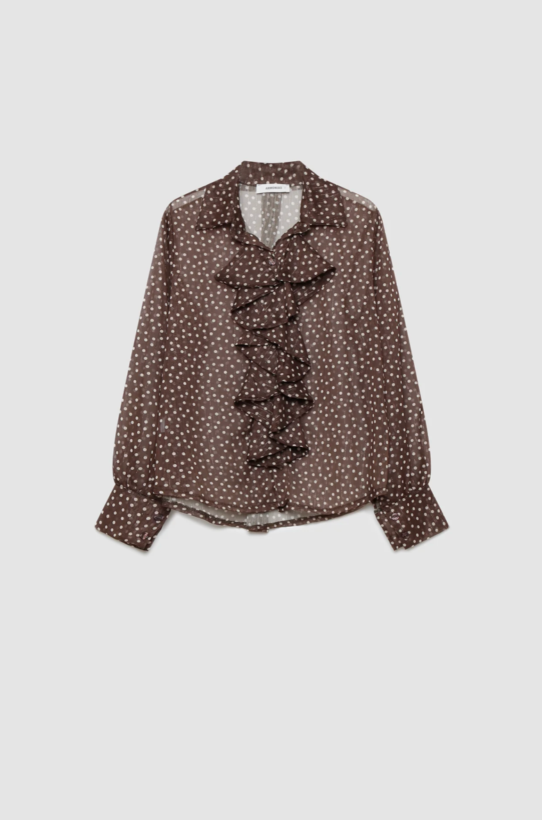 Sa coupe fluide et légère assure un tombé parfait, tandis que son imprimé à pois apporte une note de féminité subtile. Polyvalent, il se porte aussi bien rentré dans un pantalon taille haute qu’avec une jupe pour un look raffiné et tendance.