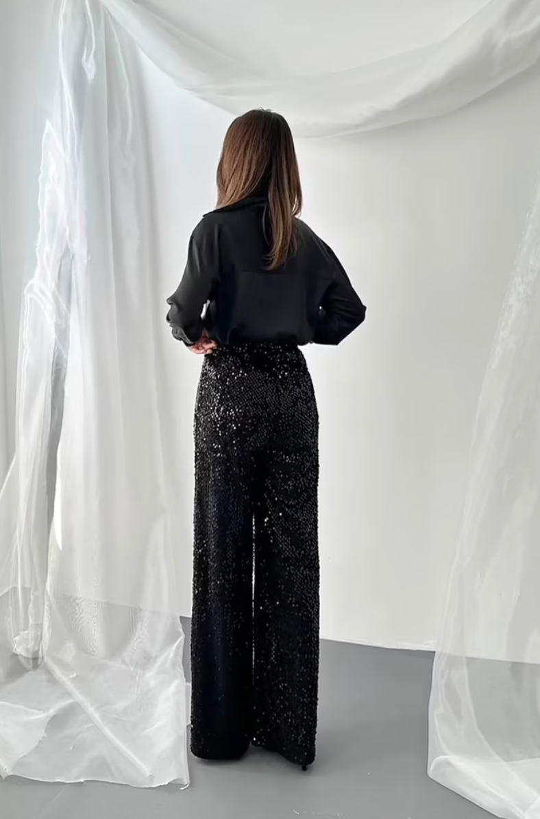 Pantalon Taille Haute Noir à Paillettes – Glamour & Élégant